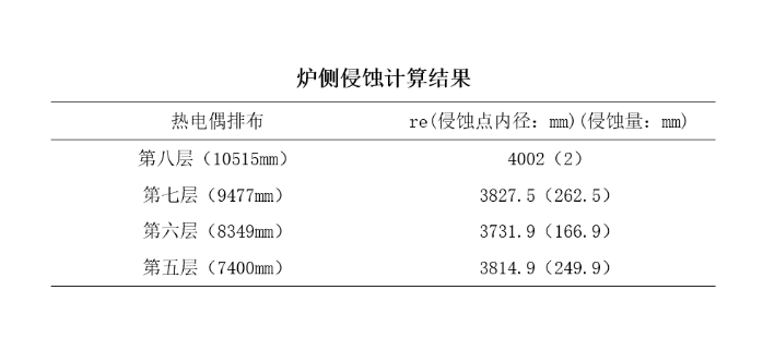 中陽鋼鐵1#高爐投產(chǎn)一年后,利用一維穩(wěn)態(tài)導(dǎo)熱模型對爐底爐缸侵蝕量進(jìn)行測算,結(jié)果表明:爐缸側(cè)壁侵蝕量最大為263mm,象腳區(qū)為250mm,爐底侵蝕量最大為70mm。